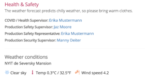 Automatic call sheet weather report based on shooting location for film, TV; video and broadcasting.